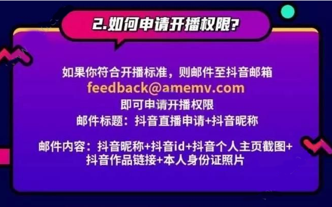 当你满足条件之后就可以申请了,发送邮箱至feedbback@amemv.com,邮件标题:抖音直播申请+抖音昵称