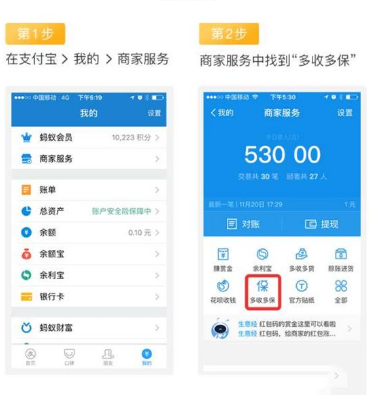 打开支付宝,点击“我的”,进入到“商家服务”,找到“多收多保”;