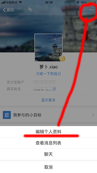3、然后点击右上角的三个“点”,选择【编辑个人资料】