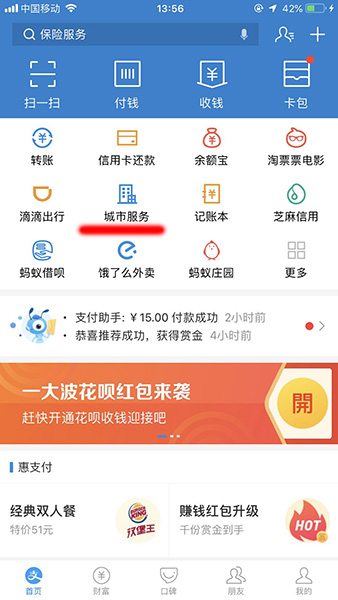 1、首先,下载游戏爱好者新版的支付宝,完成以后直接在支付宝首页进入【城市服务】: