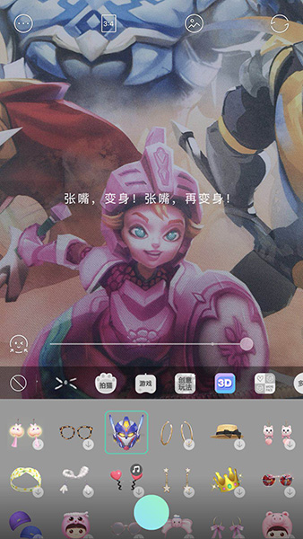 4、点击头盔特效进行拍摄,系统会提醒你只要嘴巴张开,就会自动的生成变形金刚头盔特效。