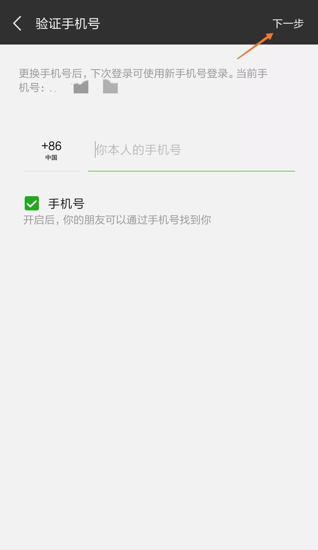 6、将验证码填入后,点击下一步。现在可以用原来的手机号去申请新的微信号。
