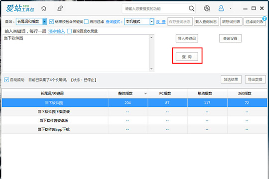 2、大家需要在左上角的关键词框中输入想要查询的核心关键词,如果有多个关键词想要同时查询,则需要使用每行一词;的格式,接着点击右边红框标注内的查询;功能开始查询,如下图所示: