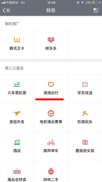 2、然后在钱包当中找到【滴滴出行】
