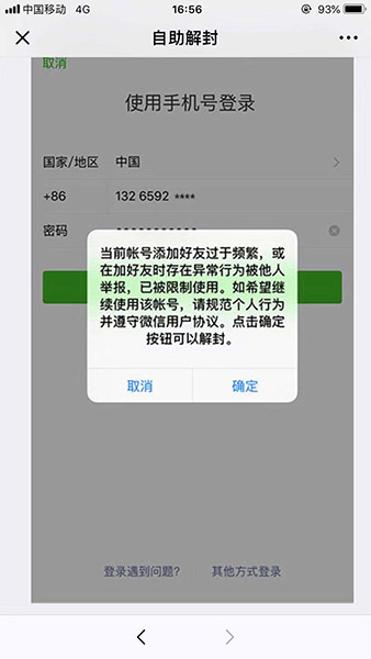 2、点击完之后按照流程走就可以完成申请解封了。如果遇到下面这种情况微信是不能解封的