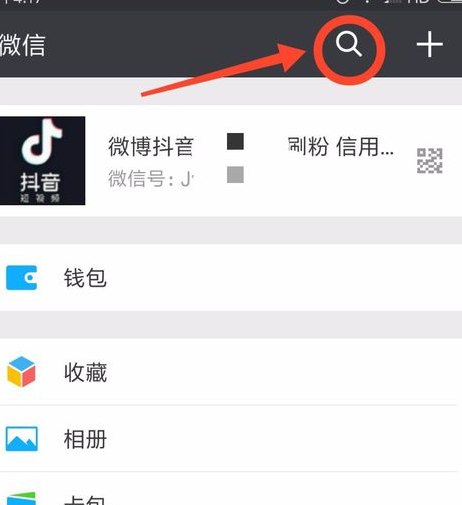 2、打开微信,点击右上角的搜索按钮,输入“抖音短视频去水印”。