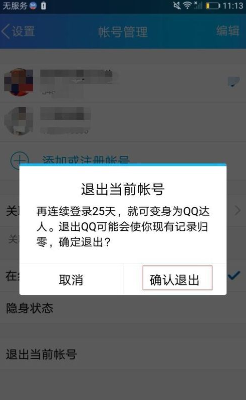 4、出现【退出当前帐号】对话框,点【确认确出】;