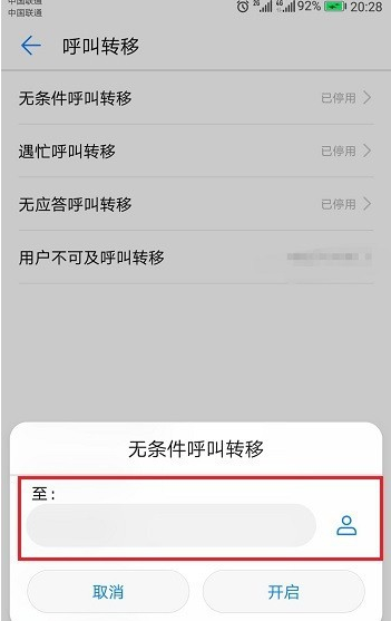 5、这里就可以填写呼叫转移的号码了,最后点击开启