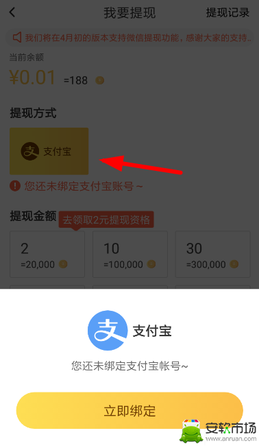 4、点击之后我们就可以进入提现的界面,之后我们只要绑定支付宝就可以成功提现到支付宝了。