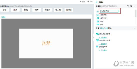 3. 点击菜单栏中的【高级界面 - 新增界面】,新增一个容器,在【组件库】点击容器名,更改为【好感度界面】便于区分。