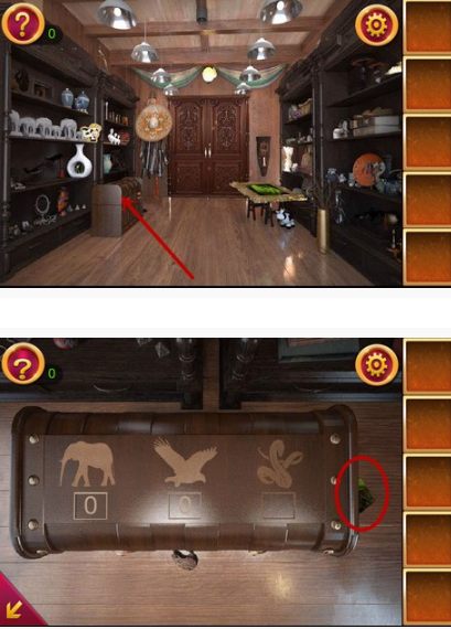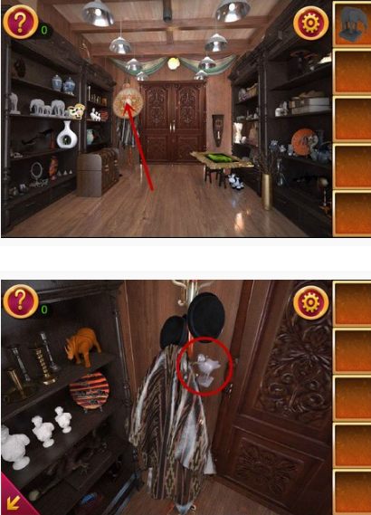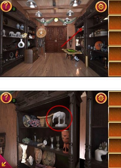 本关一开始要把注意力集中在房间右边的架子上,点击架子,在架子上有一只大象,先收起来