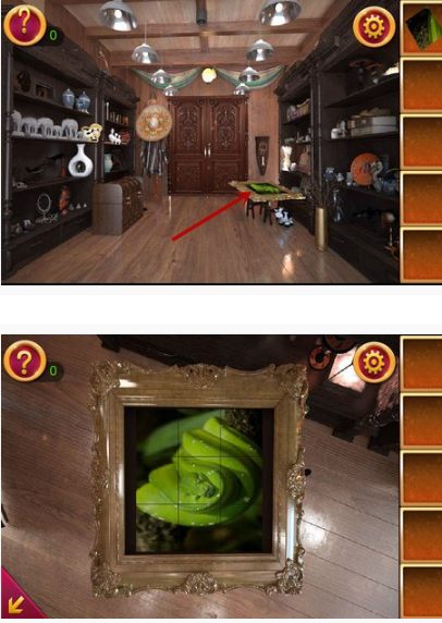 这时点击房建左边的架子,可以看到上面放着许多大小不一样的大象,将刚刚我们拿到的大象也放上去,然后将大象从左到右按照从大到小的顺序排列,这时可以看到上面有一条蛇