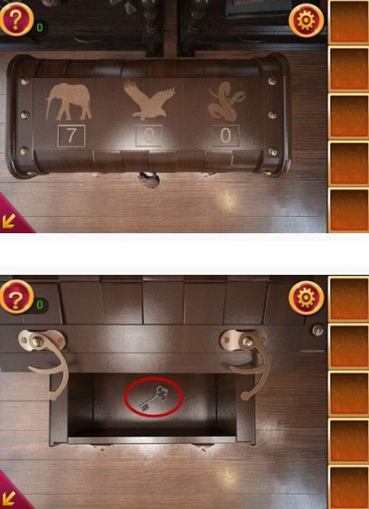 现在大象的数量一共是7只,小鸟1只,蛇两只。这时我们点击大宝箱,把数字对应动物的图标,填在宝箱上面,宝箱打开后,可以拿到钥匙
