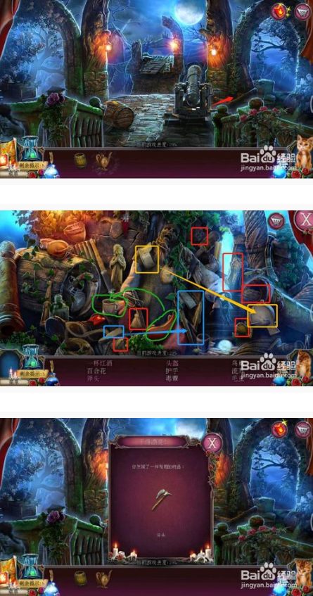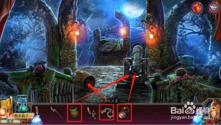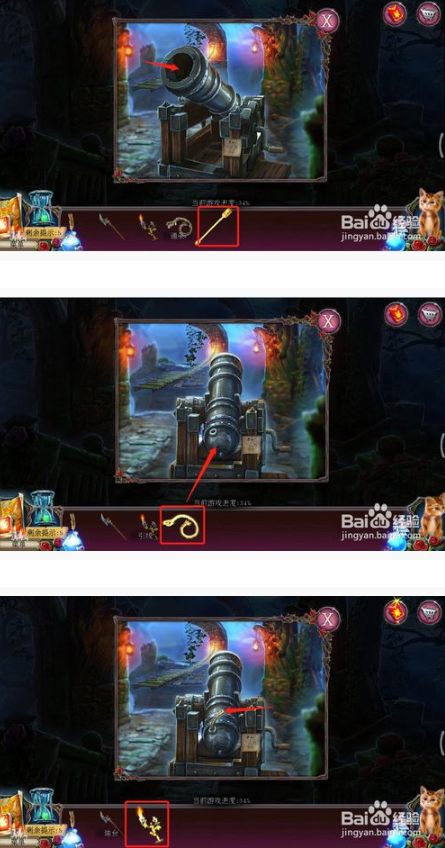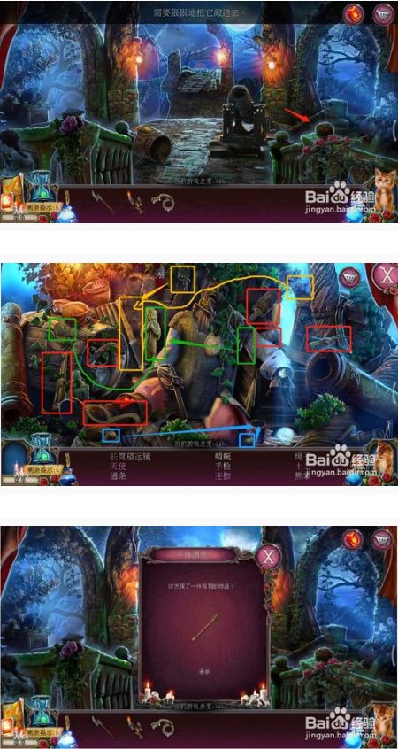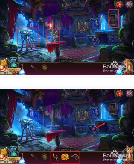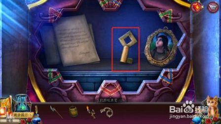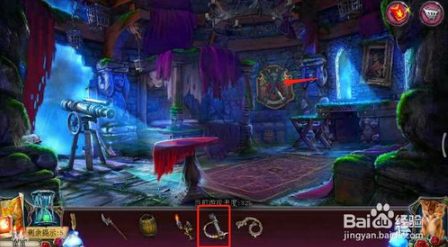 来到塔楼,先从望远镜里拿到徽章,从桌子上拿到烛台,从画像那里拿到绳子。然后点击画像下面的桌子。
