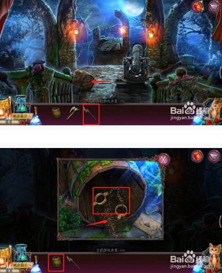 用斧头打开木桶,拿到里面的脚铐,并用空桶装火药。