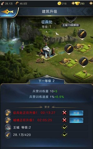 经常上线的玩家是有极大福利的,当一个建筑升级的时间少于7分钟的时候(非VIP玩家),玩家可以手动免费升级,也就是说在玩家的建筑等级较低的时候,建筑物是可以立刻提升等级,不需要等待的,玩家可以利用这项建筑升级福利将所有农田、伐木场、征兵处、医疗所的建筑快速升级到3级而不需要等待时间。这里建议将这几个建筑全部升级至5级,即使花费金币也要升级,这样可以使以后建造更方便。