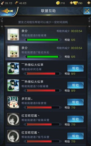 在游戏中,玩家可以自己建立联盟或者加入别的玩家的联盟。而加入联盟以后就可以呼叫盟友帮忙加速建造建筑了。只要是建筑未完成,建筑的头上便有个求助标记,只要点击就可以呼唤盟友了,让盟友来帮忙建造了。