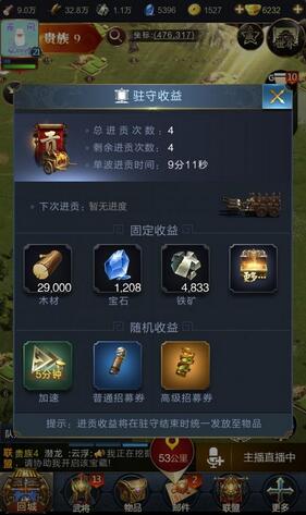 占领据点自然也少不了收益,和资源点的模式有些类似,据点带给我们的收益不是一下子产生的,而是由据点分次进贡得到的。这个过程中我们需要一直驻守在据点之中,每一个据点都有着固定的进贡次数,每一次进贡的时间则是根据据点的等级而变化,等级越高时间越长,我们的驻守压力也越大。同样据点会提供固定的收益和一些随机收益,固定收益大多是资源,而随机收益则是一些实用的道具。