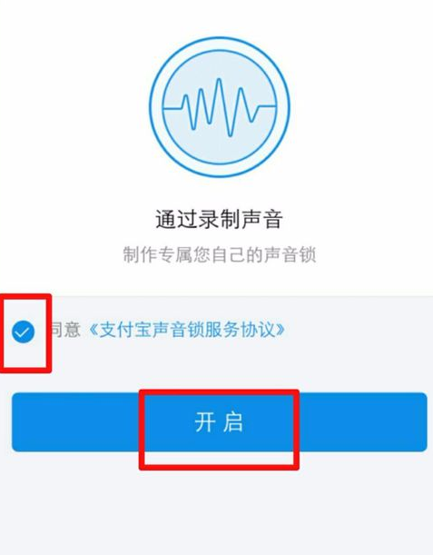 4.在声音锁界面点击勾选服务协议,然后点击【开启】。