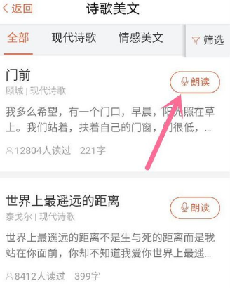 然后,再选择想要朗读的文章,点击文章旁边的朗读按钮。