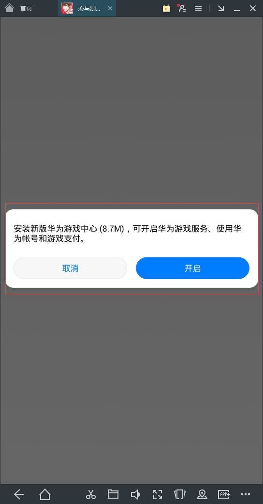 4.运行游戏,并在游戏弹出的提示安装华为游戏中心,模拟器下载完成后安装即可进行游戏。