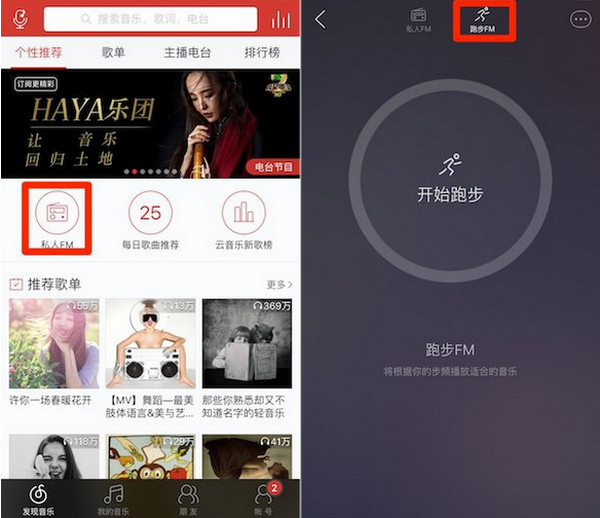 第一步:需要下载最新版的网易云音乐,上面有PC6小编为大家提供的网易云音乐最新版下载地址,下载完毕安装好后,打开首页进入私人FM,选择跑步FM。