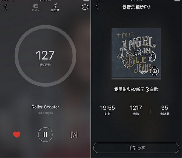 第二步:这个时刻你可以开始跑步了,当网易云音乐跑步fm感测到你的跑步步伐后,就会推荐出适合你跑步的音乐。同时还有暂停,下一首,添加到喜欢的诸多功能。