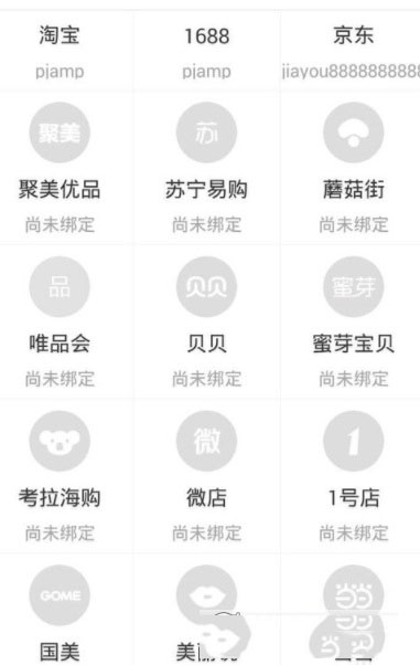 2.进入界面后,会显示有很多购物网站,以下的账号都是可以绑定的哟!而前面的淘宝和阿里巴巴是点亮的,说明已经默认为绑定账号。
