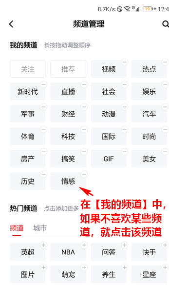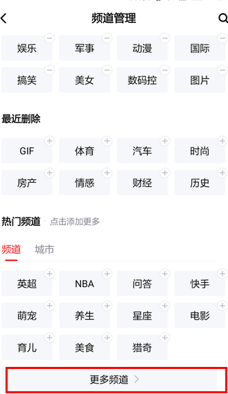 4.相反,如果对某些没有在天天快报显示的频道有兴趣,则可以在【热门频道】下点击,将其添加上来。