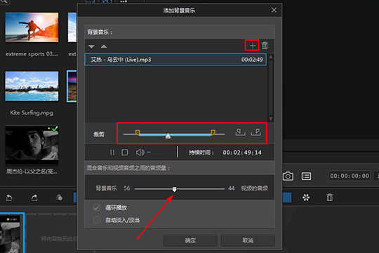 4、弹出添加背景音乐的界面,首先点击上方的添加;选项添加音乐文件,接着根据自己的需要在裁剪;中调整音乐持续的时间,当然你也可以点击播放按钮,边听边设置具体的时间点,最后调整混合音乐和视频音频之间的音频量,如果你想要与原本视频中的音频形成混声效果,则可以将往右边移动并调整;如果你想要完全替换视频中的背景音乐,则可以将背景音乐;的数值拉到100,也就是将其拉到最左边,最后点击确定;即可,如下图所示: