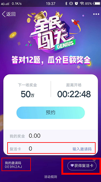 1、打开答题直播的主页,输入朋友的邀请码就能获得复活卡,而且你们的朋友也能获得一张哦~