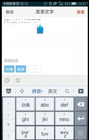 3、进入后编辑你想要编辑的文字,段子里只可以添加便签与@别人不能发图片,;编辑完成后点击右上角发表。
