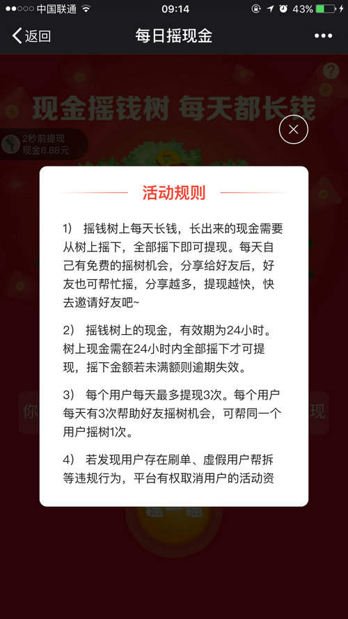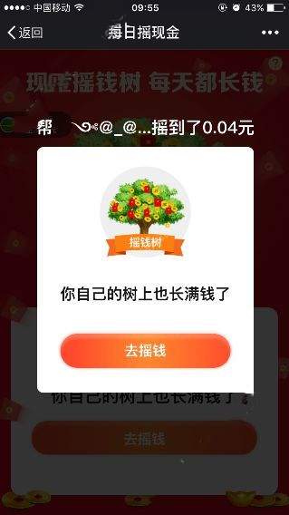 拼多多每天会送给大家一个摇钱树,而摇钱树上有一定的金额,大家需要将摇钱树上的全部金额摇下来才算这次活动成功。