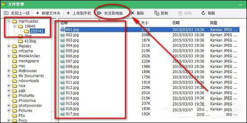 2、在手机上点击【发送到电脑】将漫画文件夹导入到电脑中。