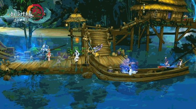 4、七秀桃花村右上角路引石开心眼往左走,走到由船搭成的小桥的第一个小船(从右往左数)时,开心眼寻找跳跃点,不用跳过去,在跳跃点的位置开心眼寻找竹简并拾取。