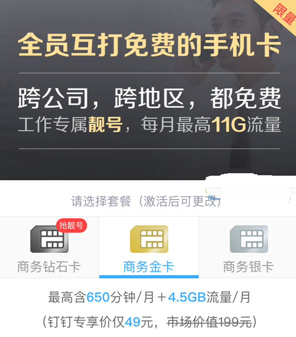 钉钉卡激活首月免月租使用;首次充值,充值金额大于等于100元送100元,大于等于50元送50元,大于等于30元送30元,大于等于20元送20元。最高赠送100元,赠送金额会在24小时内到账。