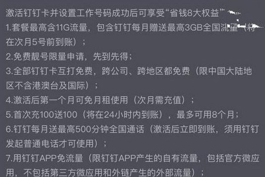 3.值得注意的是钉钉卡在开户月可以免费使用,并享受充值100元返100元的优惠,优惠话费最多可以使用八个月,在钉钉卡互打之外,套餐内的部分通话时间需要通过钉钉APP发起普通通话才可以享受,具体请参见套餐详情。