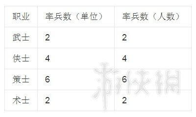 关于带兵数量如图,比如武士可以带2个1格兵或1个2格兵,策士可以带6个1格兵或3个2格兵或2个2格兵+2个1格兵等等,拳士带兵数量同侠士。