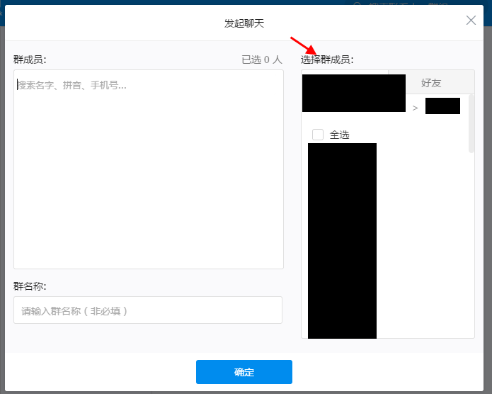在选择群成员中选中想要发起群聊的对象,输入群名称,然后点击确定即可开始群聊了。