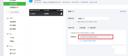 5.把直播间链接设置在微信公众号菜单栏,微信公众号左边【自定义菜单】-【菜单名称】-【跳转网页】,把复制好的直播间入口链接复制进去即可。