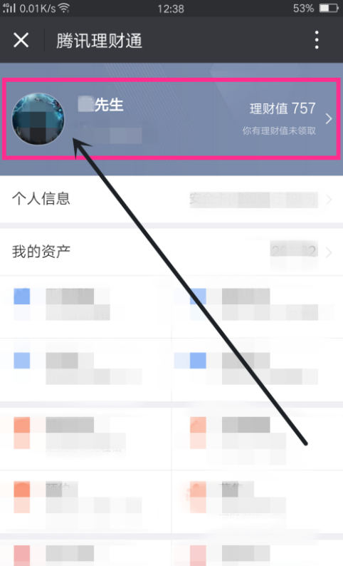 4、我的页面中,点击自己的头像(在右侧会提示你:理财值未领取),如图所示,