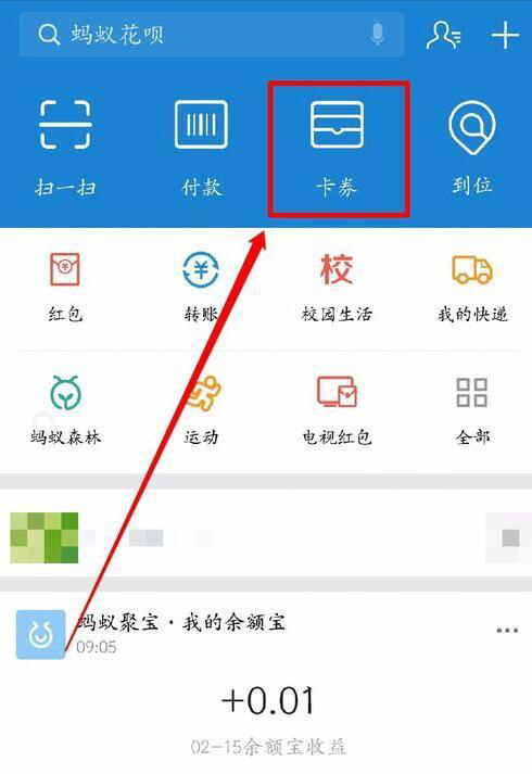 2.第二步,点击支付宝里面的“卡券”,查看自己,是否有没有过期的余额宝红包。
