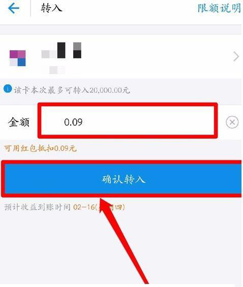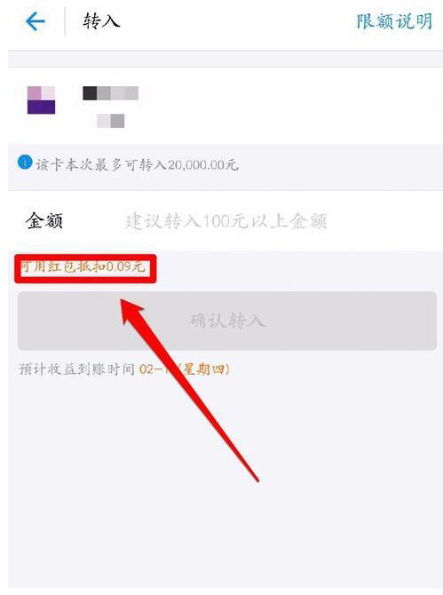 6.这时候会跳转到余额宝的支付界面,在转入金额输入框的左下方有串红色小字,这里会显示,目前你的余额宝红包卡券的总金额。