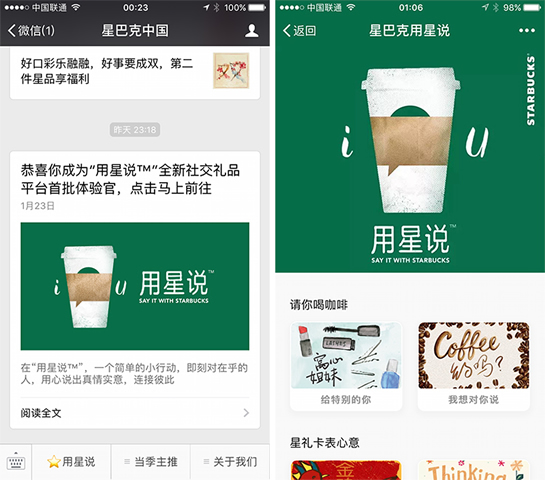 星巴克用星说小程序是基于微信来实现的,得到邀请之后,星巴克的微信号下方导航栏会出现“用星说”的选项,选择之后就能进入到主界面。