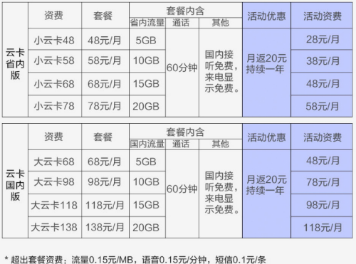 省内版称之为小云卡,套餐有48元、58元、68元、78元四档,其中48元档提供5GB省内流量、60分钟通话。