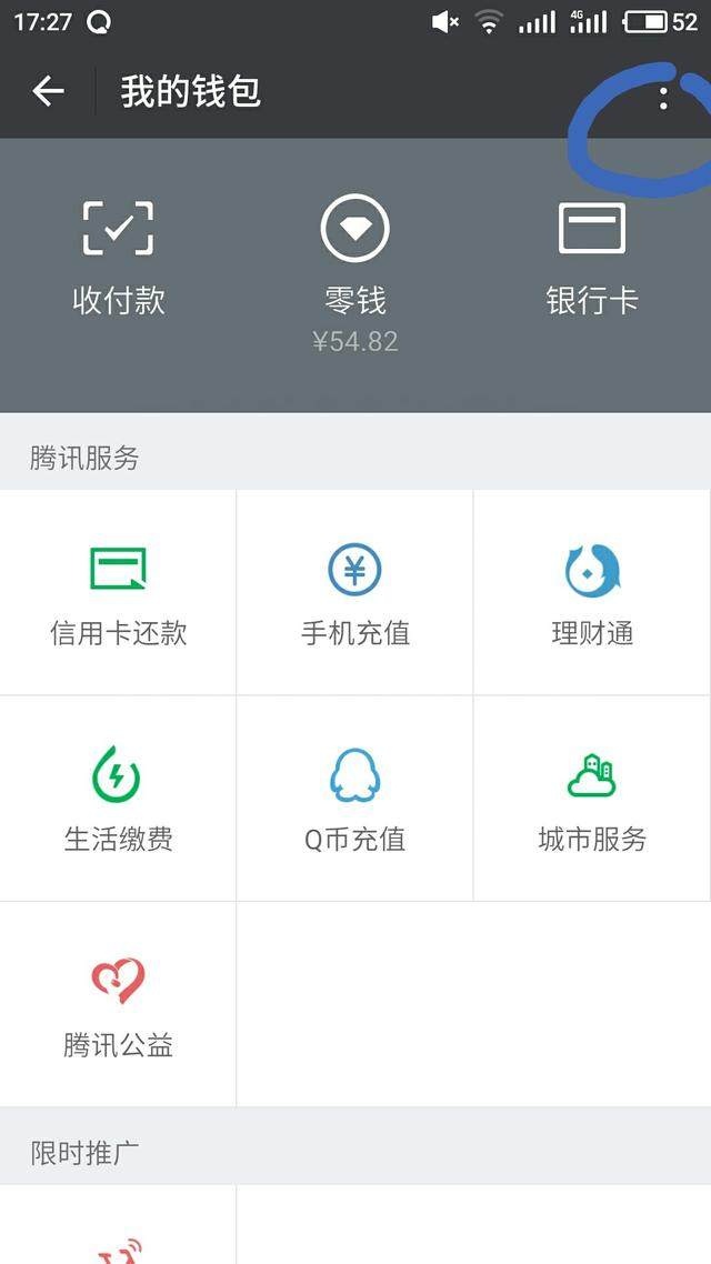 1、进入微信中的“钱包” , 点击右上角三小点。