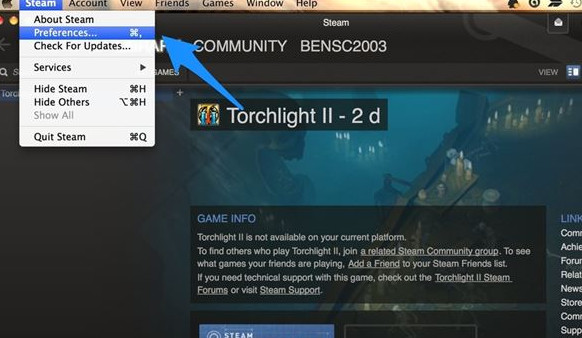在 Steam 的菜单中选项中,点击打开 Preferences 选项,如图所示
