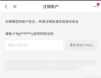 3. 点击搜一搜,进入注销账户页面,说明注销账户会放弃有关权益和资产,点击「下一步」后系统会向绑定的手机号码发送验证码,
