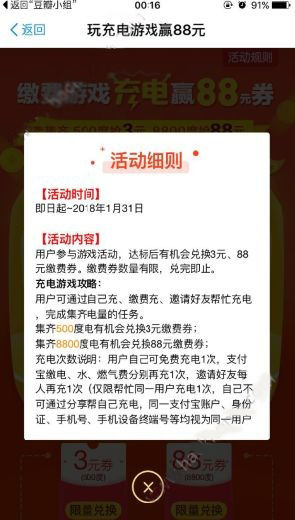 3、进入后可以看到活动细则,集齐8800度点就有机会兑换88元缴费券;
