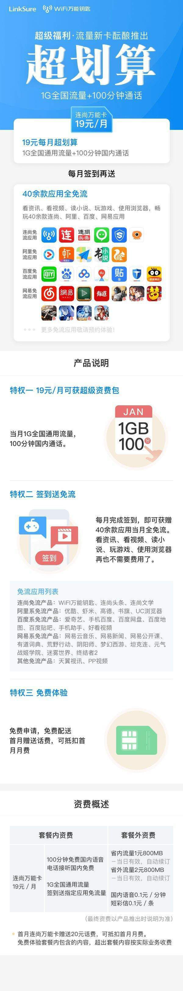 据了解,连尚万能卡月租费为19元,套餐内包含1GB的全国流量+100分钟的国内语音通话。在超出范围的语音资费为0.1元/分钟,短彩信资费为0.1元/条;超出范围的流量资费为1元/800M省内,2元/800M国内,仅限当日有效,自动退订。